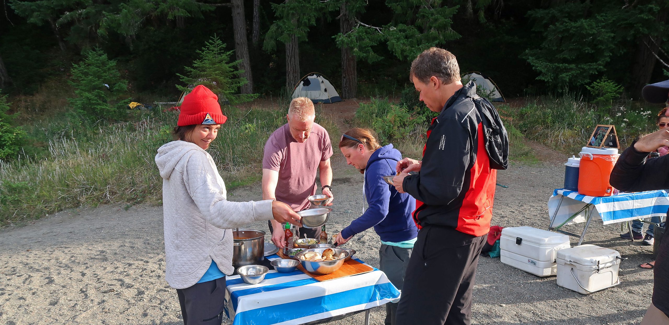 Let’s get to the food – OMG! Andy and Mike set up an unbelievable “kitchen” on the river, and over the next few days continually out did themselves with wonderful spreads. We had all kinds of fresh fruits, vegetables, cheeses and dips, hot tomato soup, shrimp and beef fajitas with hearty potato’s, Brie French toast with syrup and sausages, and melted chocolate for dipping fruit, and more. The passion and eagerness to please is what really got me – the guys treated us with humble pride and thoughtful presentation! Andy carved his pineapples so that you could remove a slice, like a drawer in a cabinet. He toasted his almonds to garnish the French toast. His soup came with toasted bread and optional gobs of butter, scallions, and other accompaniments. Folks, this kitchen consisted of a table and minimal equipment, set up on a river! Everything got to camp via raft! I’m leaving out too much and not properly describing my level of amazement and satisfaction here! If I can get this story published, don’t be surprised to see Andy’s “carved pineapple on the Rogue” presentation someday in Gourmet magazine!