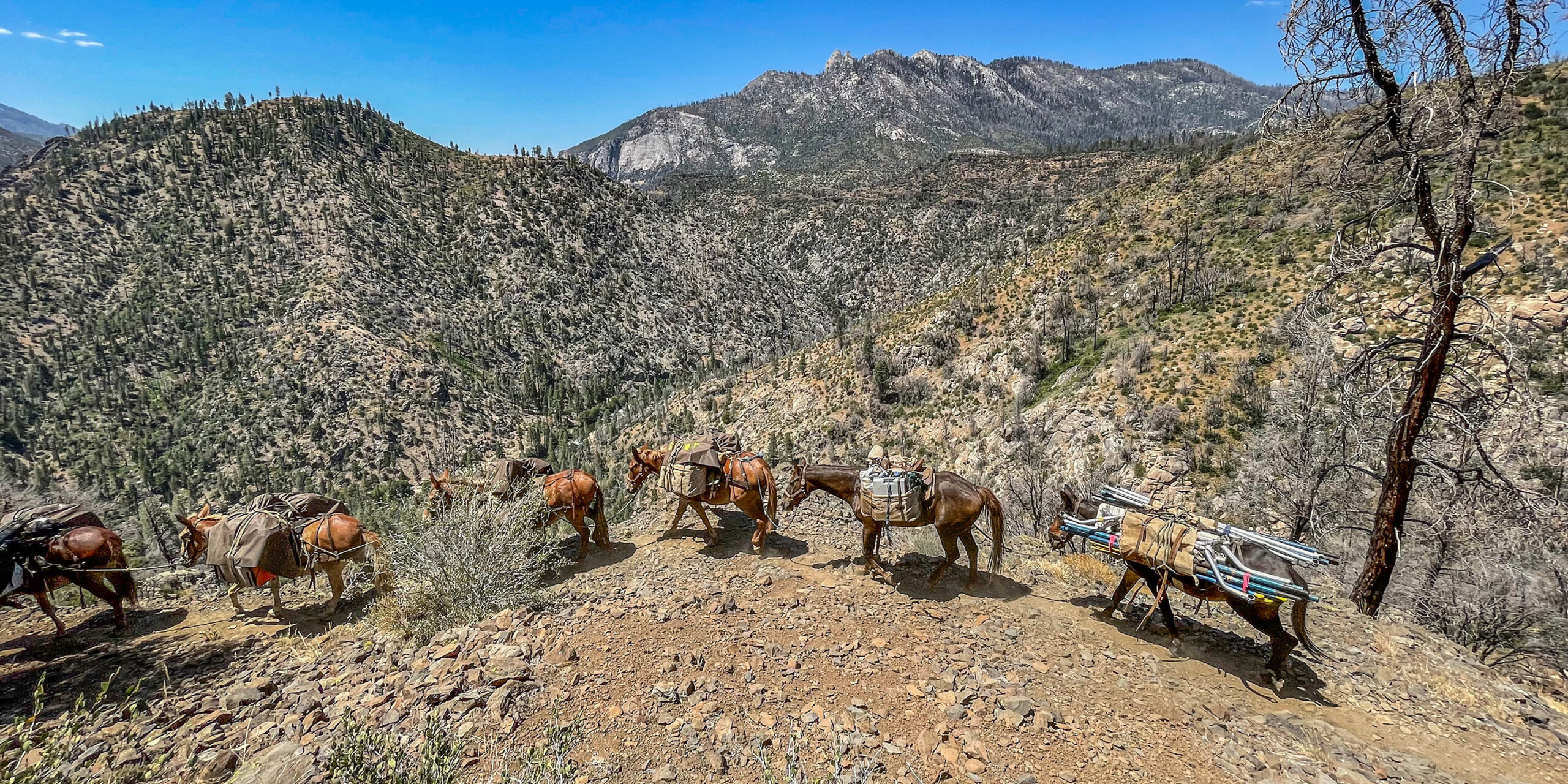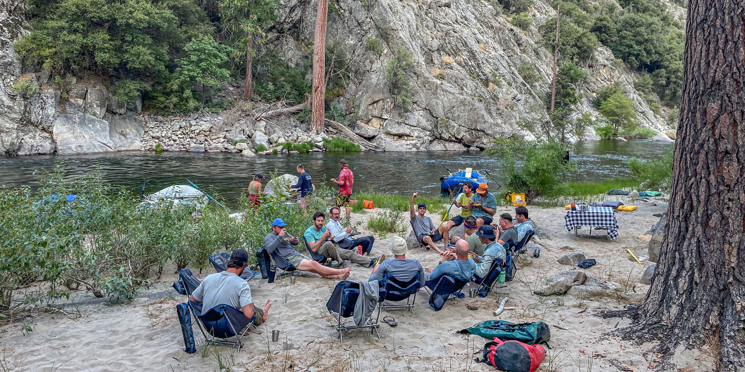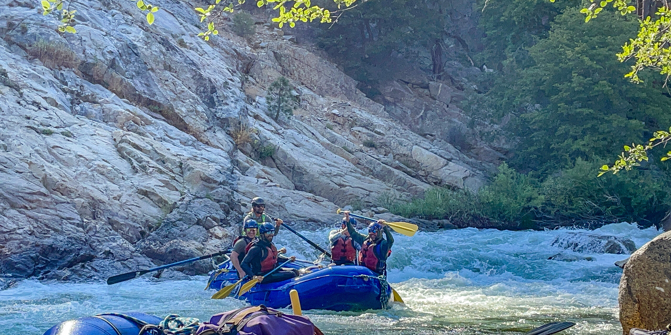 Arrive early at our River Center near Kernville California. The head guide will give out dry bags and help people pack. We will then head to the trailhead high above the canyon. There we will do a short calisthenic warm up to make sure everyone is ready before beginning the 2-mile hike into the canyon. Each guest will carry their own dry bag, life jacket, helmet, wetsuit, and paddle (note: we provide this gear). The hike in is beautiful and on most trips we will see the Mule Train that brings our rafts and food into the canyon heading back up the trail. This is a great time to give them an apple!