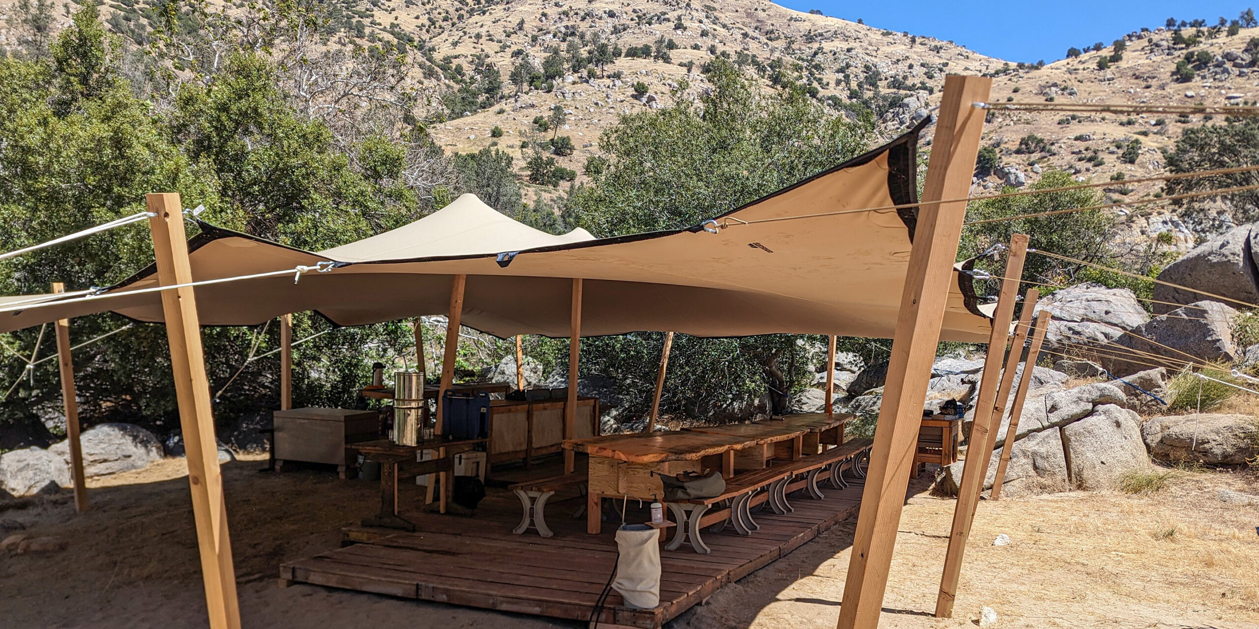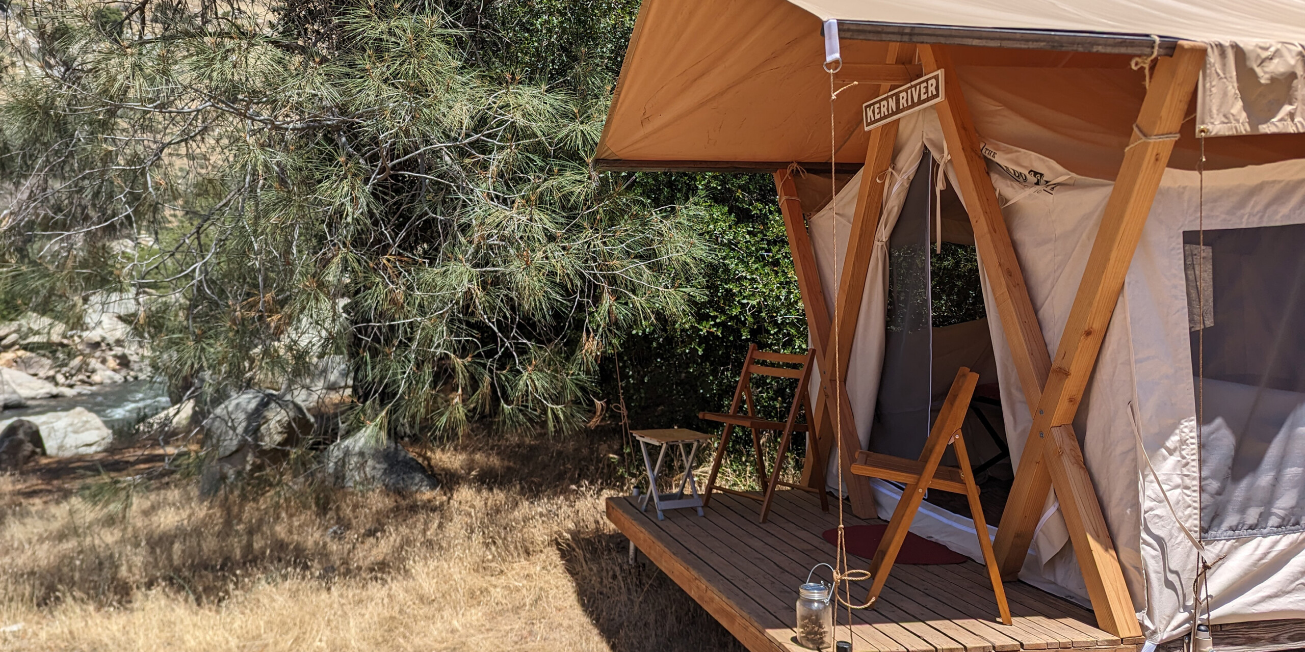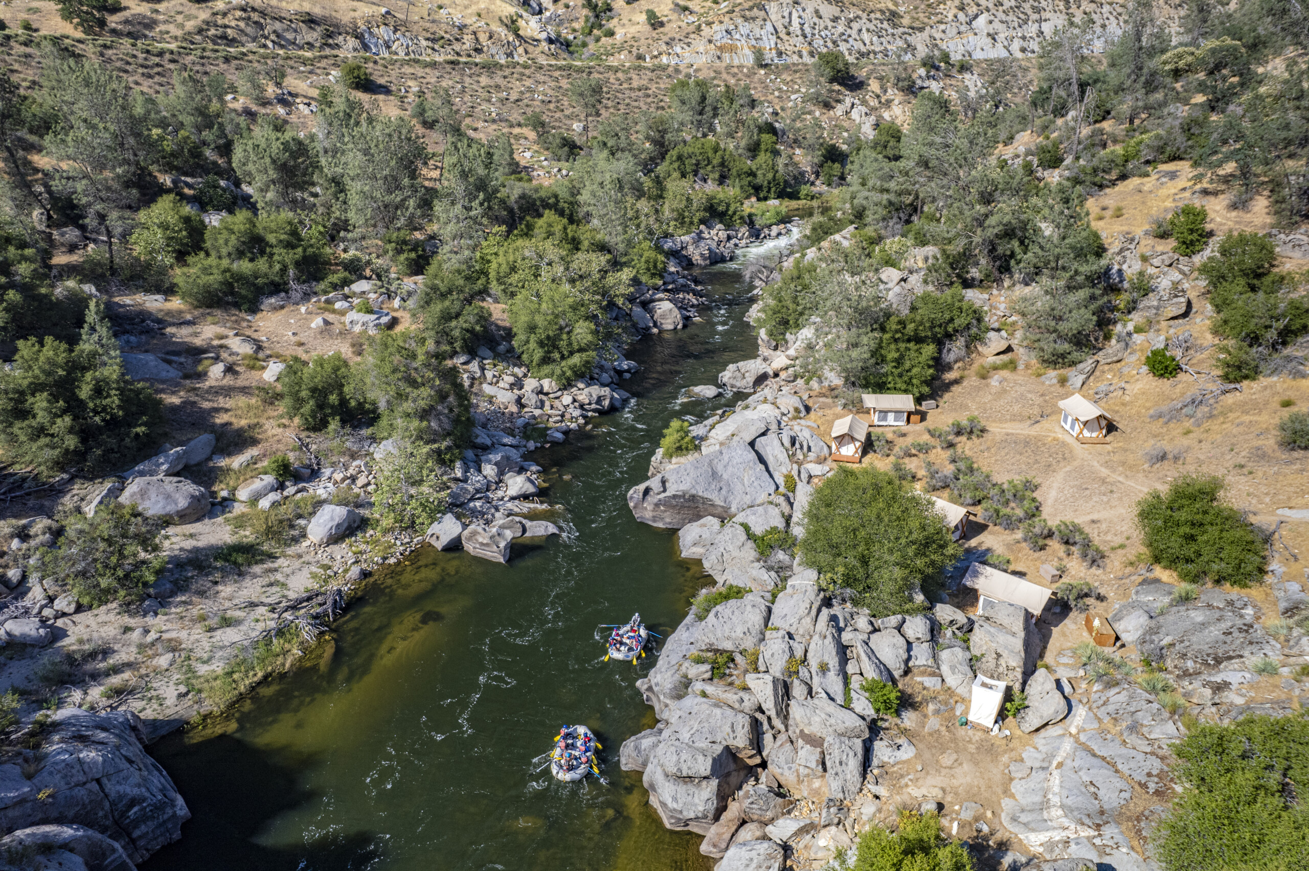 In the rugged Lower Kern River canyon, tucked between massive granite boulders, and shaded with Cottonwood and Willow, is Momentum’s Kern River Safari Camp. The camp combines safari-style flare and the Kern Canyon’s Sierra Foothills ambiance to create a unique and very comfortable deluxe camping experience.