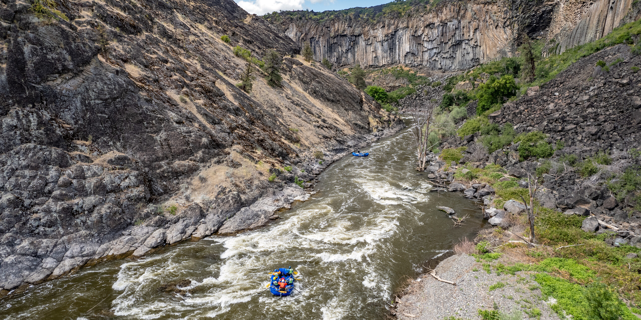 We end, back in the rafts, with Kikacéki Canyon, one of the more dramatic and imposing canyons on the West Coast, and the most concentrated section of whitewater of the trip. Vertical columnar basalt walls quickly close in, the whitewater turns back on, and we pass between two dismantled dam sites into a section of river that had almost never been run before late 2024 and was dry for over 100 years. The rapids are continuous with only one real break in the entire stretch – just long enough to truly admire the beauty of the canyon. And then we end with one of the biggest rapids of the entire trip, the mighty Kikaceki Falls.